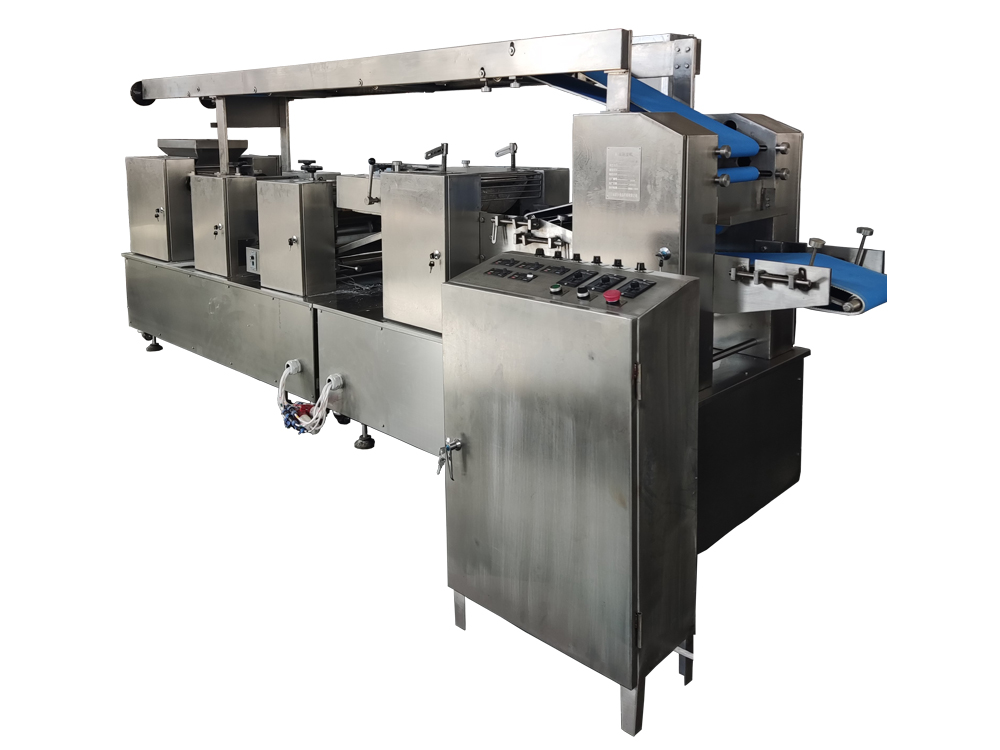 制皮機為臥式成型機,通過傳送機構將各道軋輥線速度比合理分配,實現從投料到制皮成型自動化生產。適用于餃子皮、餛飩皮、燒麥皮、蒸餃皮、以及燙面類面皮成型。